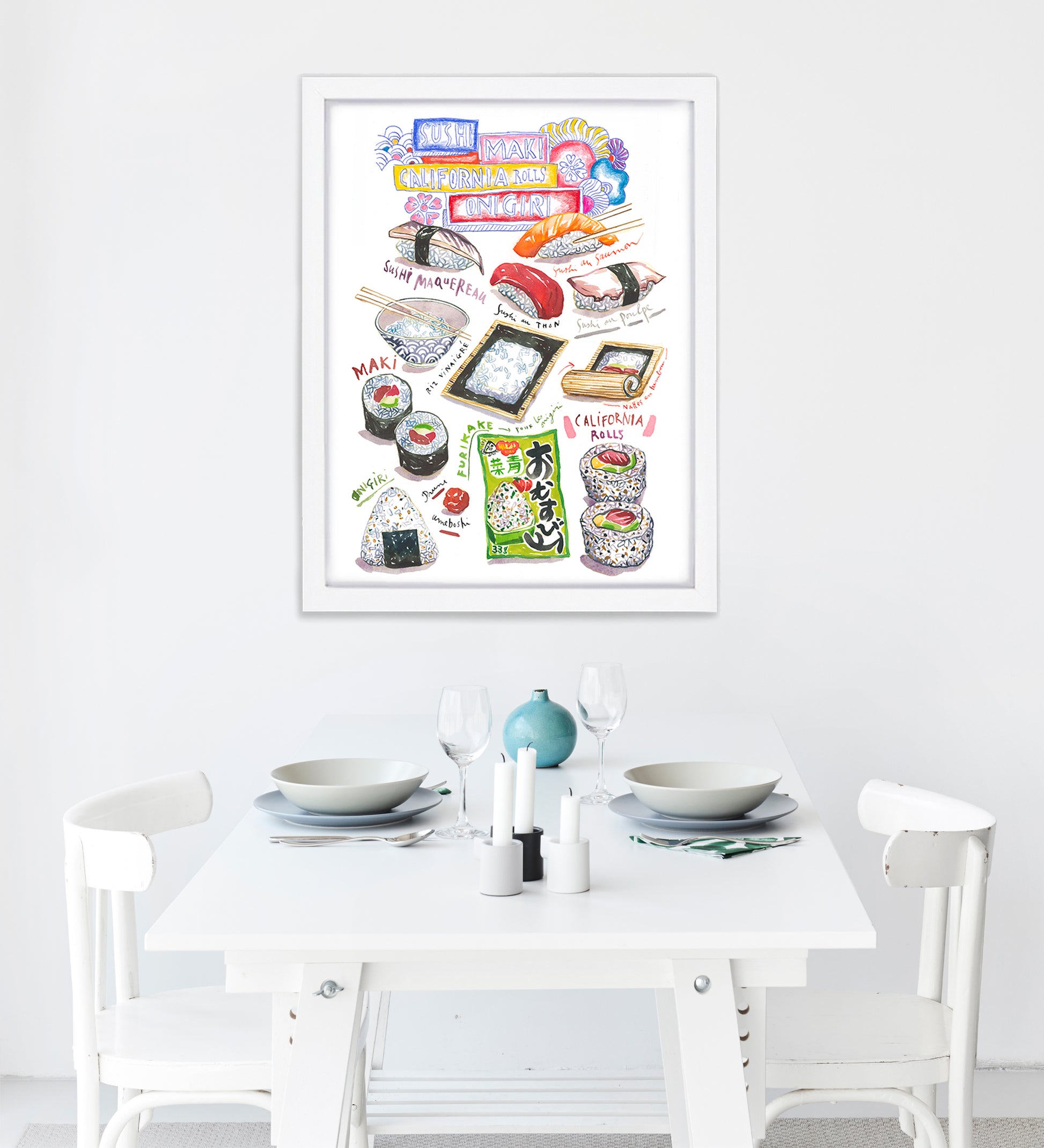 Sushi, Maki, Onigiri and California Rolls Watercolor Print