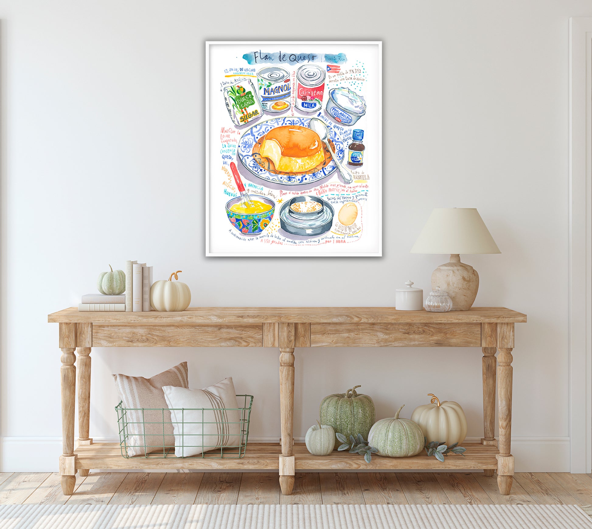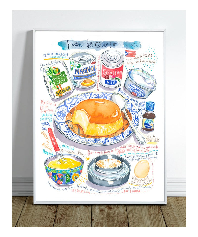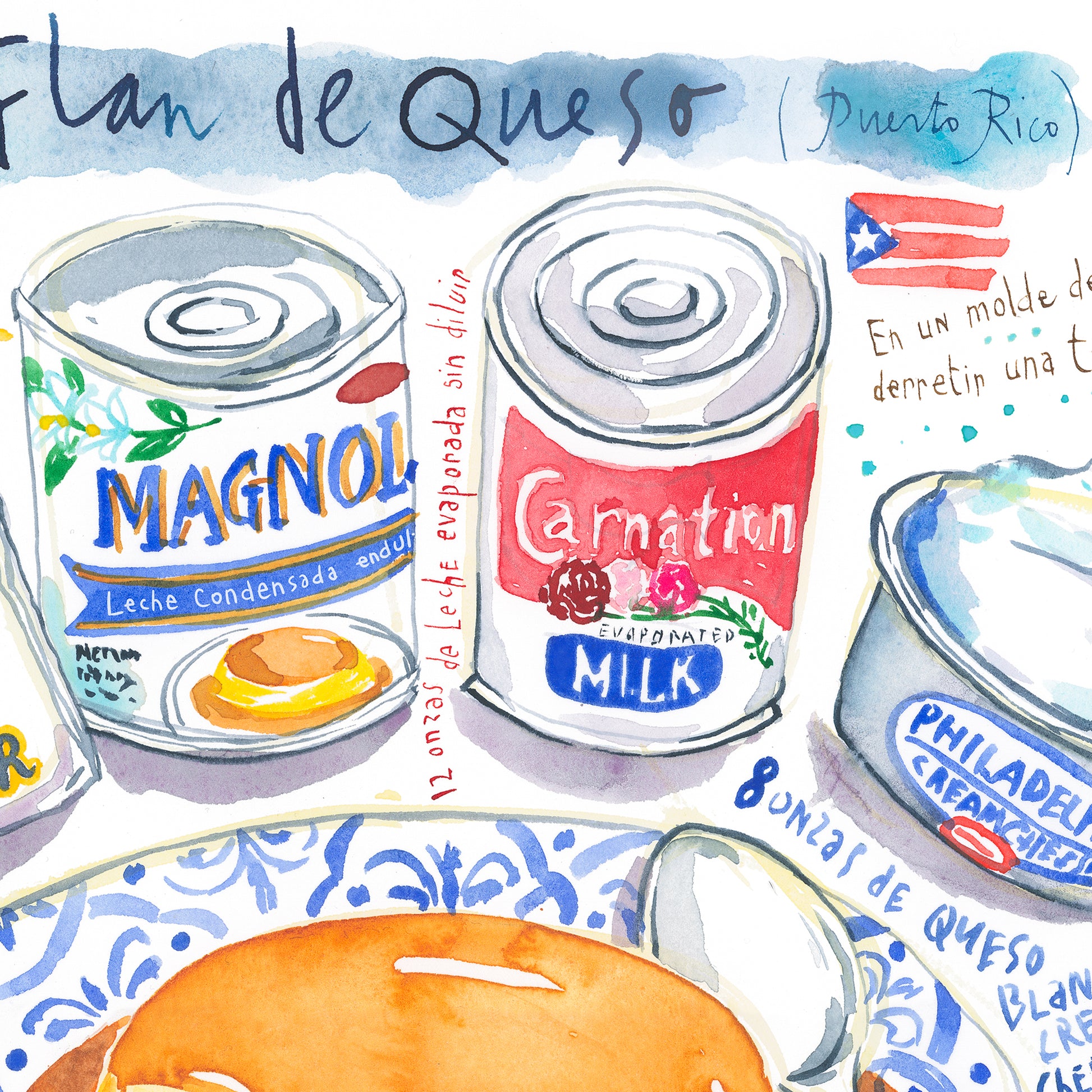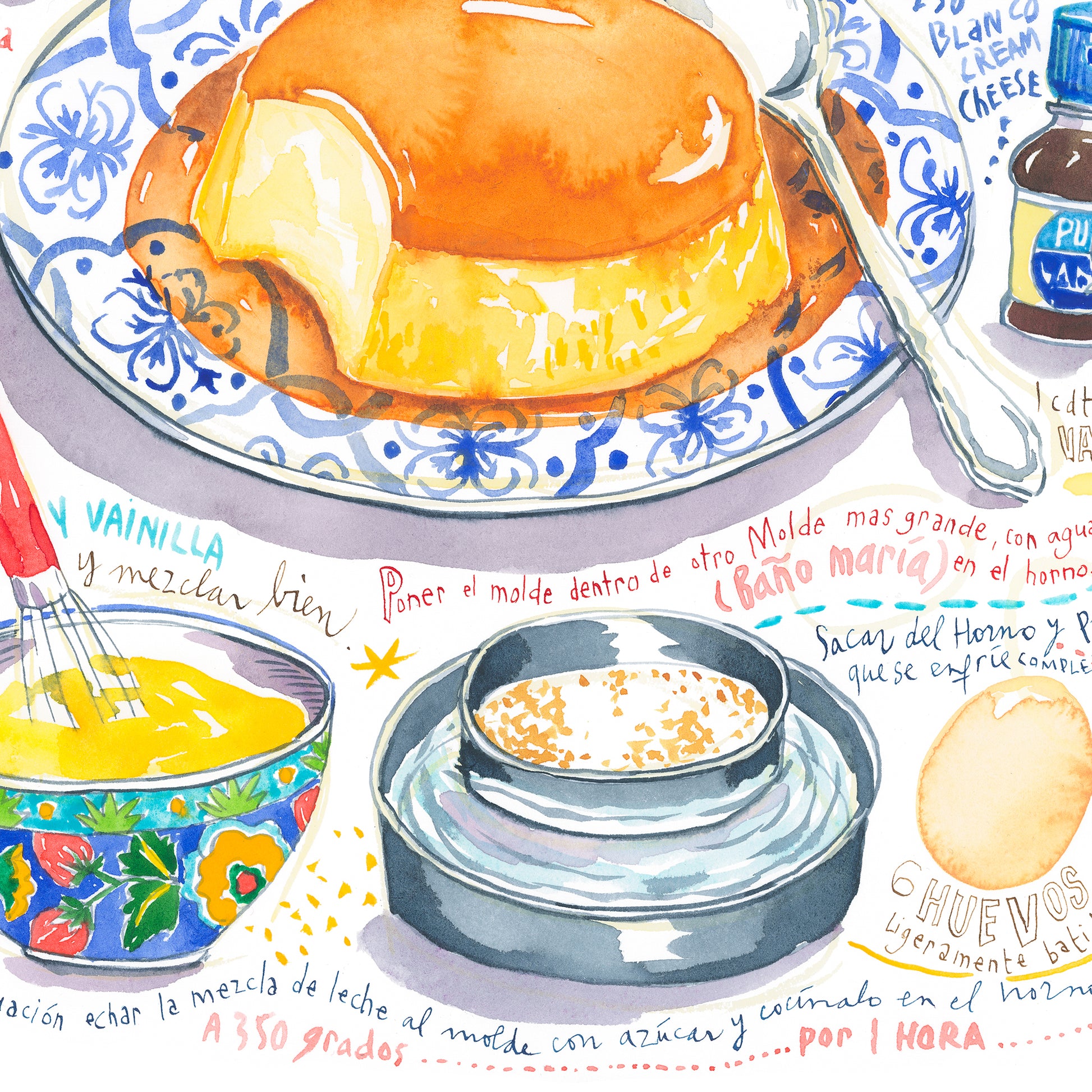 The handwritten notes for the Flan de Queso recipe are in Spanish.