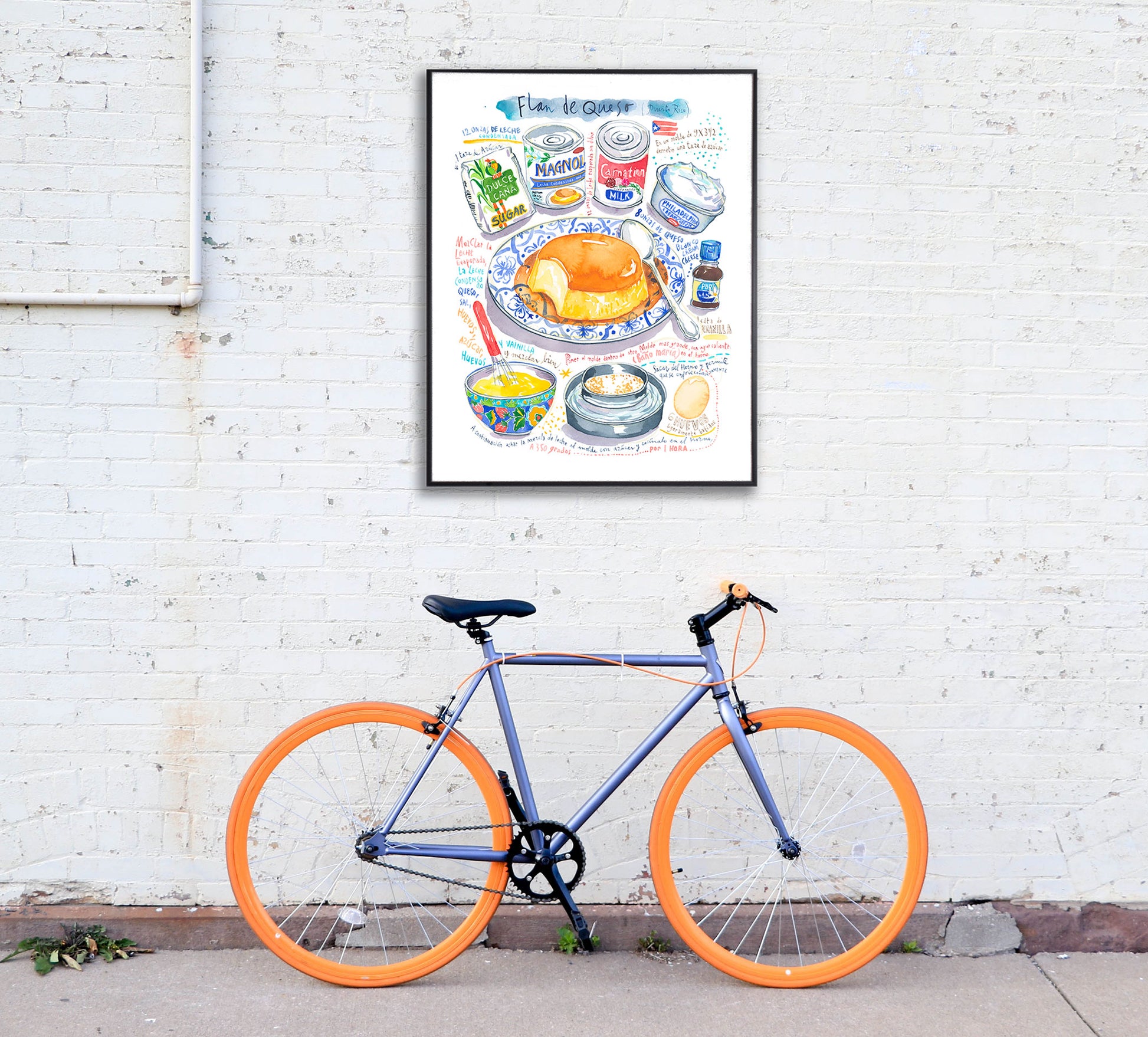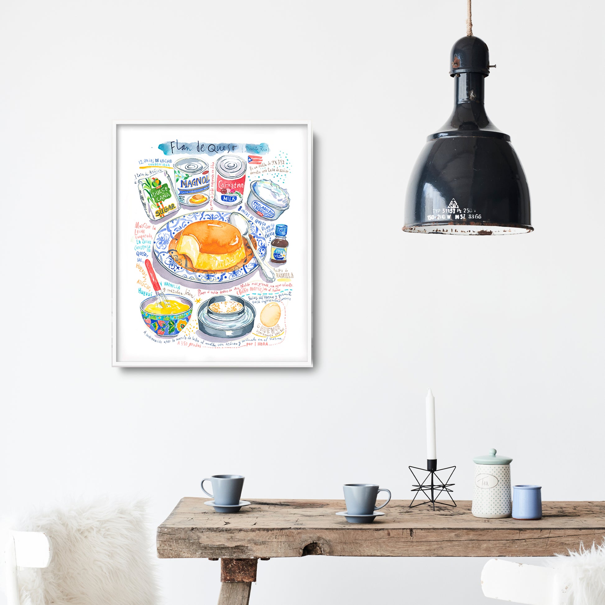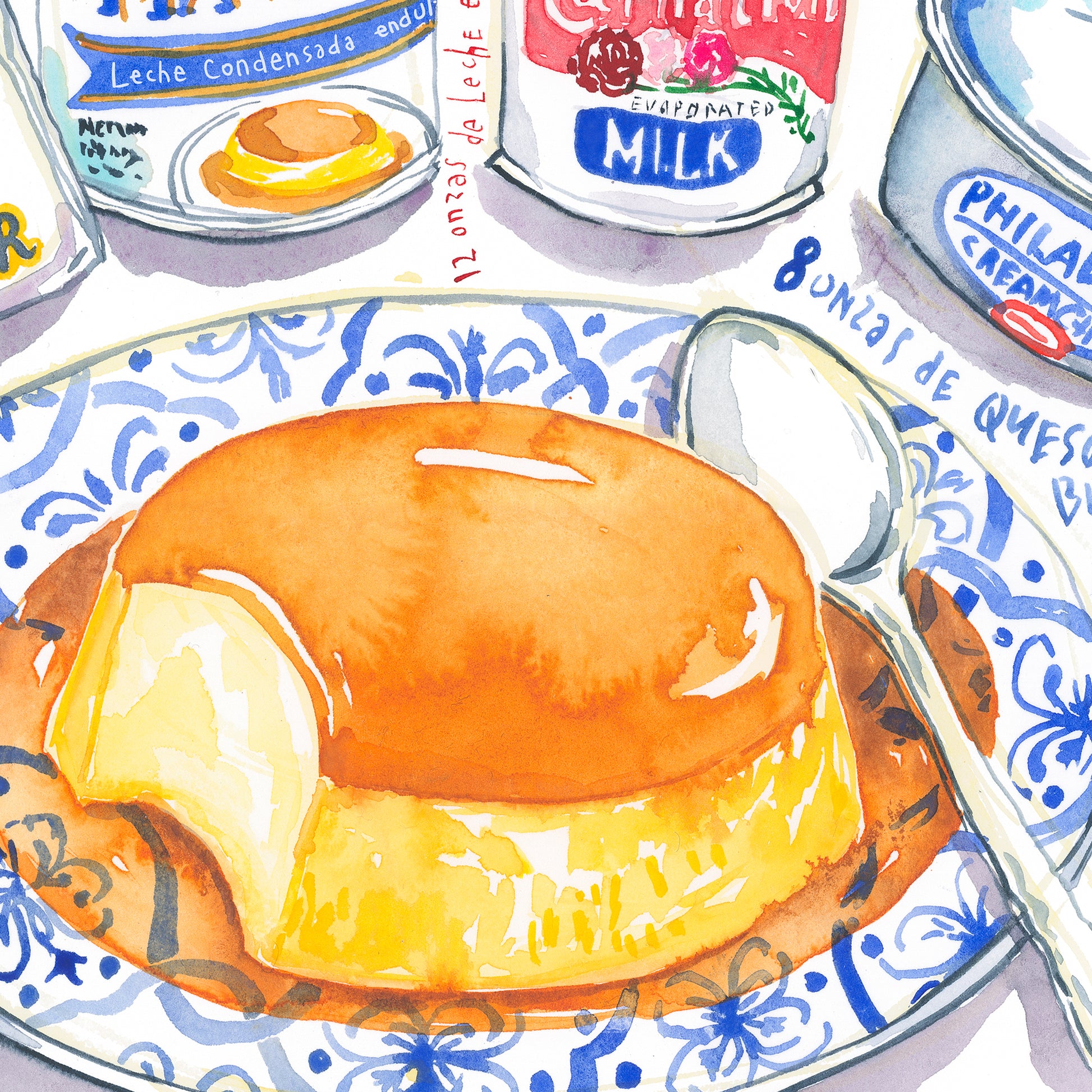 The handwritten notes for the Flan de Queso recipe are in Spanish.