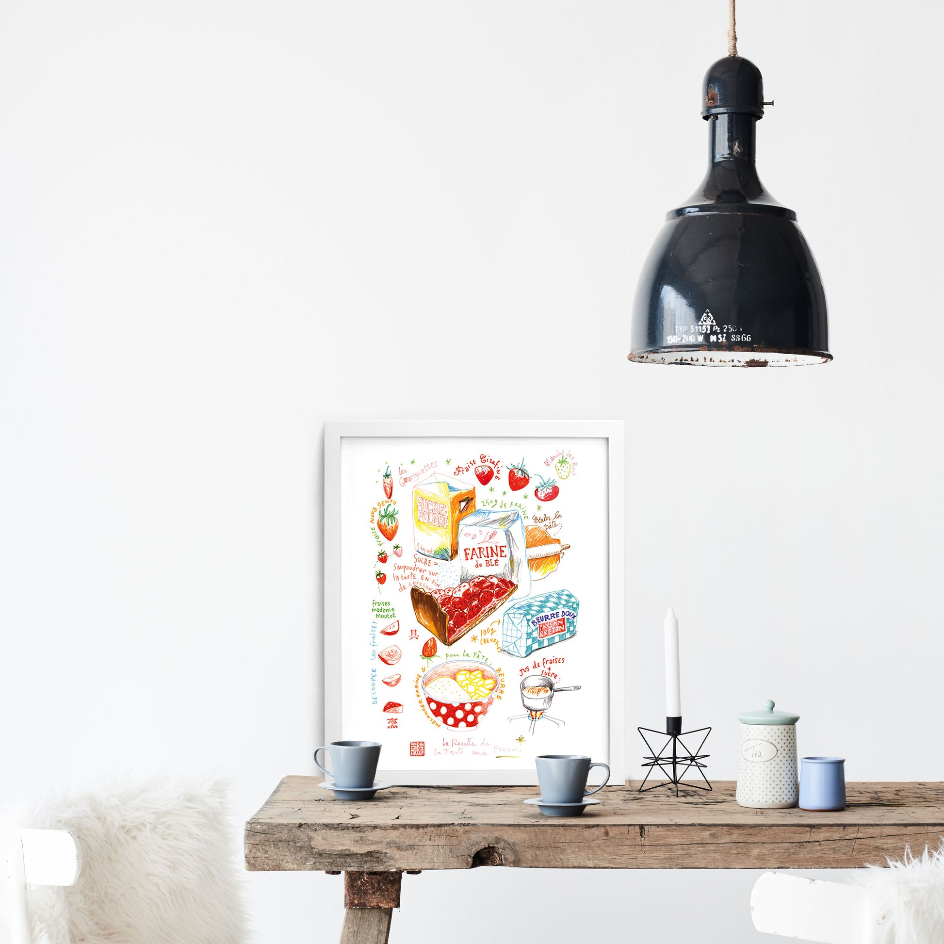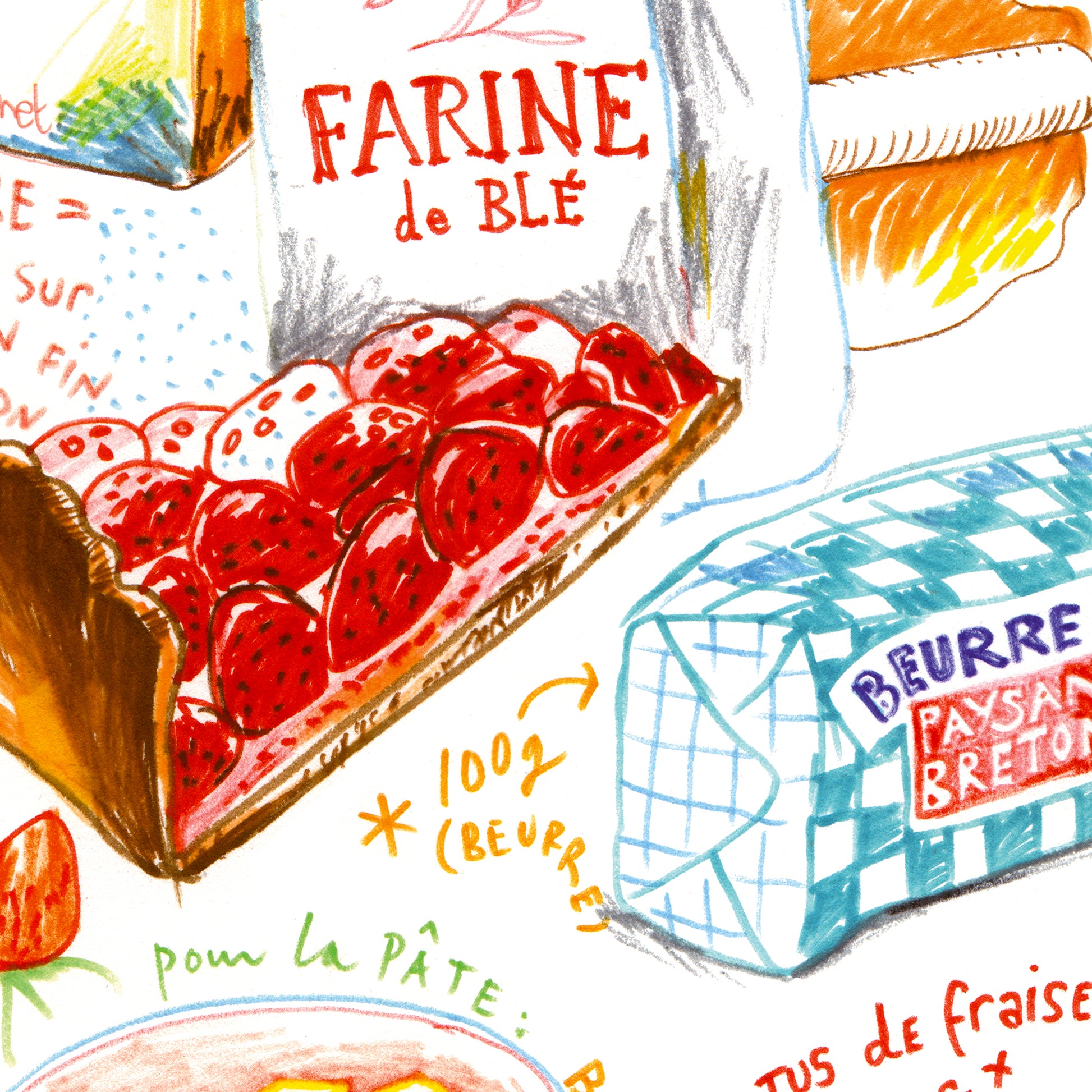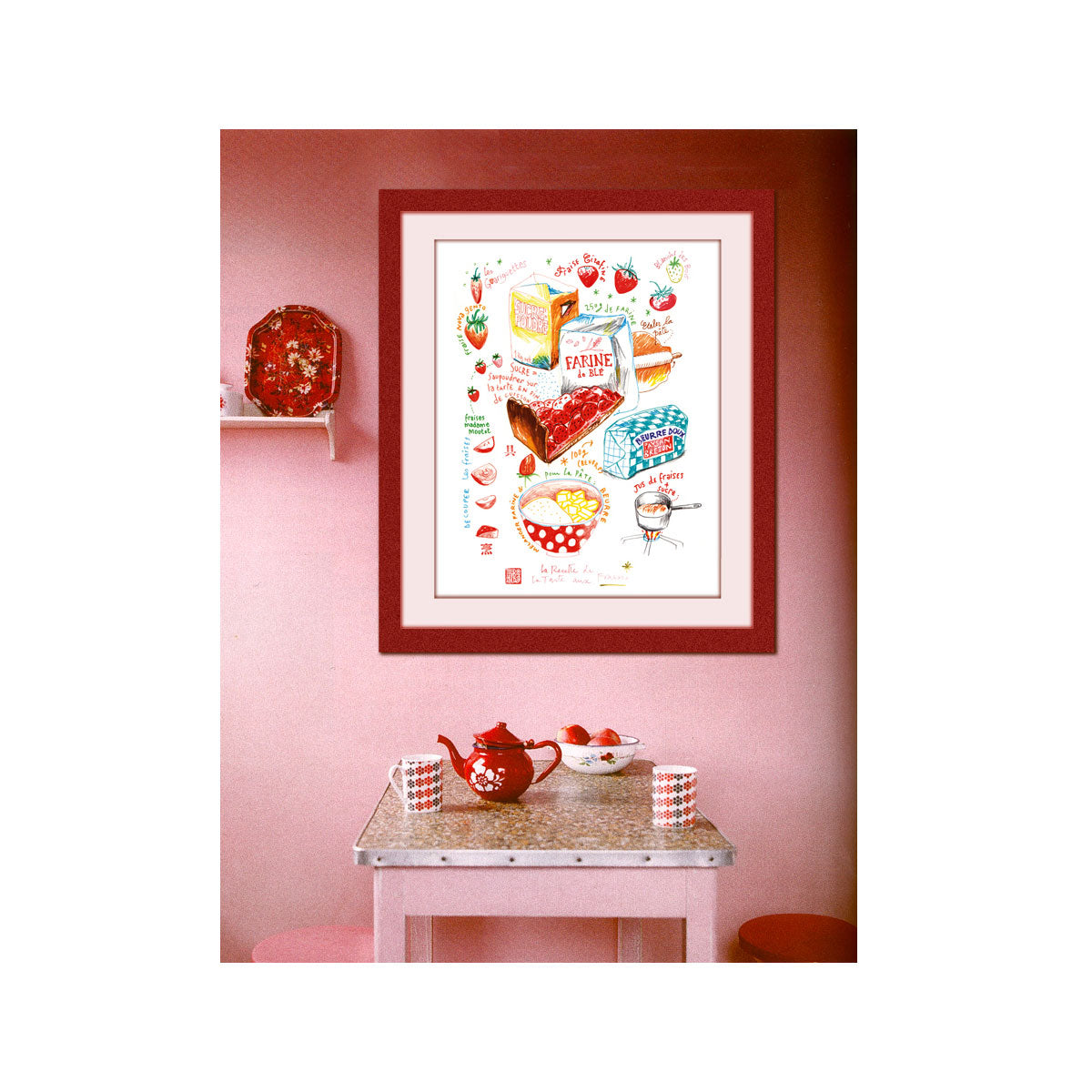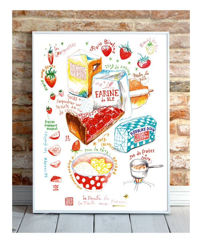 The handwritten notes for the Strawberry Tart recipe are in French.